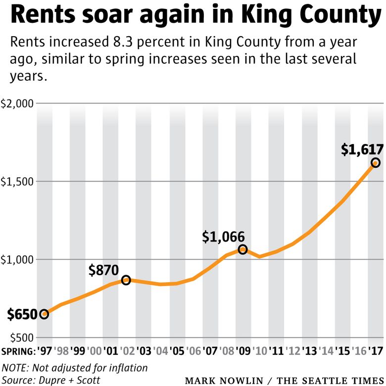 Those increases, only slightly smaller than the surges seen in recent years, put Greater Seattle among the most extreme markets in the country for rent hikes. Rents here have grown about six times faster than the national average over the last year, according to Zillow.