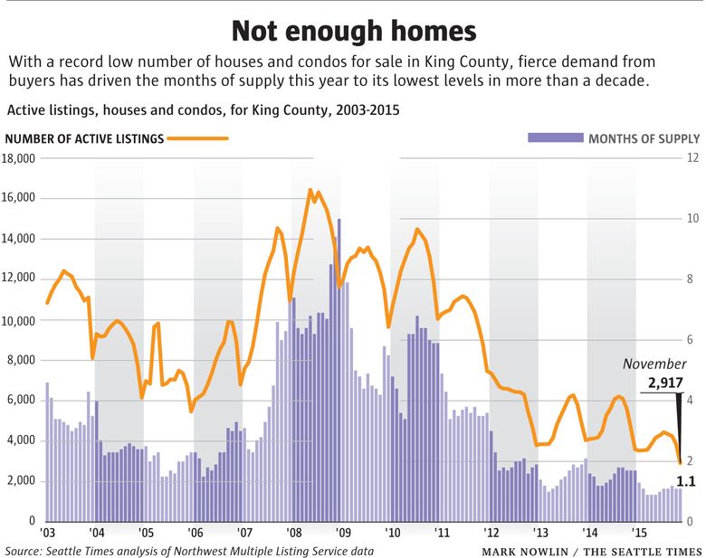 But the inventory crunch also is pushing prices of homes to new highs closer to core job centers: In Seattle, where the number of active listings was down 42 percent, the median price for homes sold jumped 20 percent to $598,000, the highest so far in 2015.