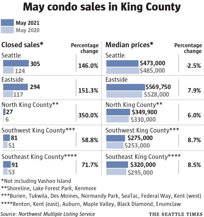 Nearly twice as many single-family home sales closed in Seattle last month as the same time a year ago. And 62% more condo sales were pending in King County compared to last year. Compared to 2019, pending condo sales were up about 17%.