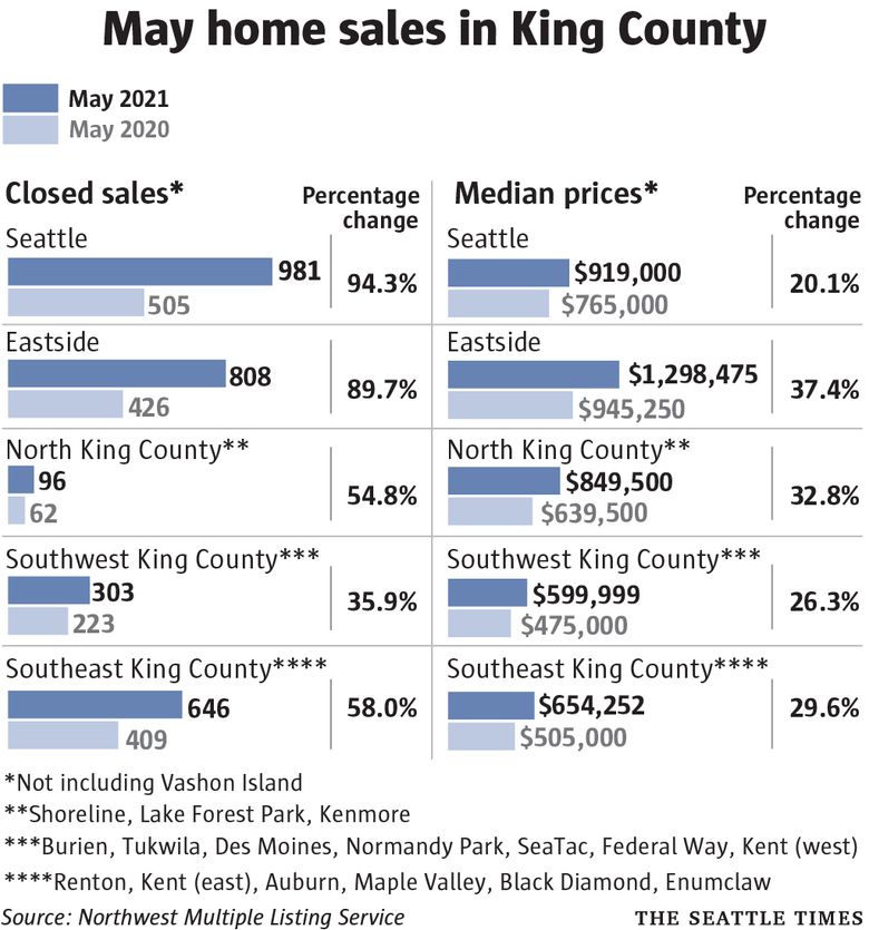 The median single-family home in King County last month sold for $869,975, a 29.5% increase from the same time last year.