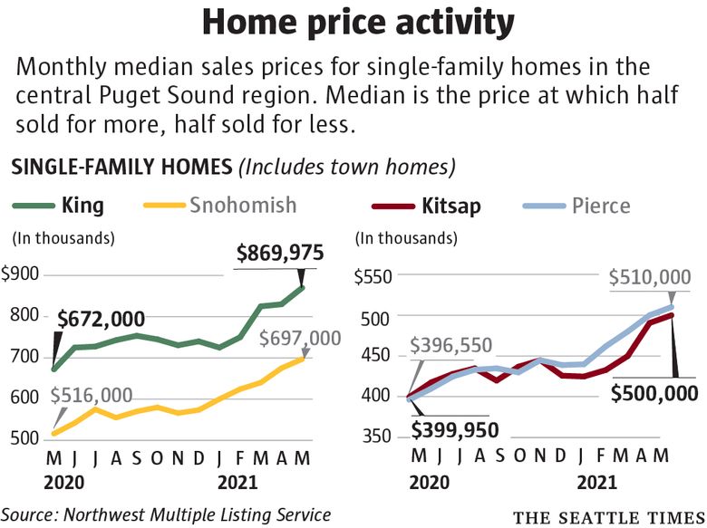 The median was $697,000 in Snohomish County (up 35%), $510,000 in Pierce County (up 29%) and $500,000 in Kitsap County (up 25%).