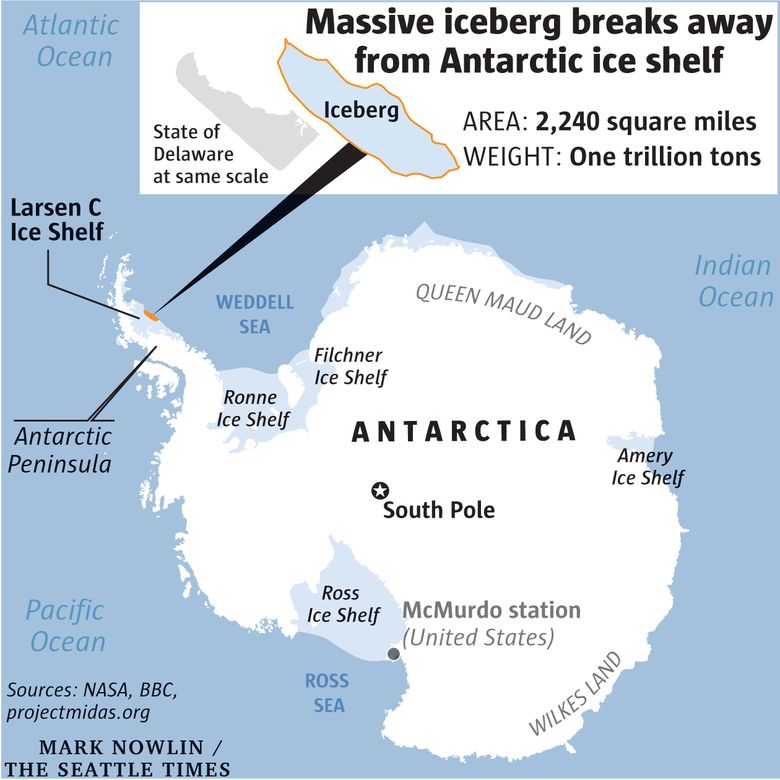 While such “calving” of icebergs is not unusual, this is an especially big one. It covers an area of roughly 2,300 square miles (6,000 square kilometers), more than twice the size of Luxembourg. Its volume is twice that of Lake Erie, according to Project MIDAS, a research group based in Britain.