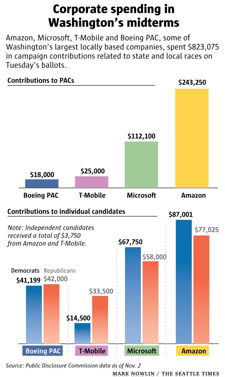 Four of Washington’s largest public companies, Amazon, Microsoft, T-Mobile and Boeing, have spent a total of $823,075 in political contributions for the midterm elections in Washington state, according to data gathered from the state Public Disclosure Commission. The data doesn’t include contributions made to super political action committees, known as super PACs.