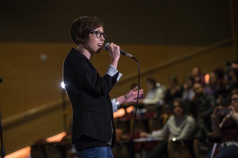 The evening began with Britt Harris, a veteran teacher from Shorewood High School in Shoreline. Harris has taught for 25 years, but said teaching is always a challenge. “I still make mistakes,” she said.  “I still get nervous on the first day of school, and at open house.”