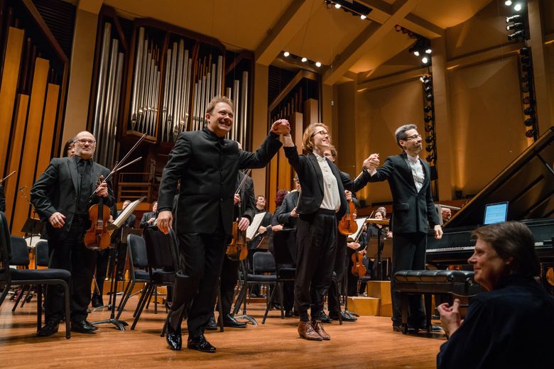 From principal oboist Mary Lynch’s reedy mastery to the politely timed coughing of its die-hard patrons (a mini-explosion between movements), the Seattle Symphony holds an eternal soft spot in my ex-oboe-player heart. But as a lapsed woodwind freak, I do not have such a predilection for piano concertos, or at least I didn’t until seeing two (two!) in the symphony’s latest offering Thursday night, pairing the classical canon (Shostakovich, Beethoven) with new work from Pulitzer Prize-winning composer Caroline Shaw — the youngest person to win a Pulitzer Prize for music when she did so in 2013 at age 30. Combine that with the whole-hog Symphony and the antic virtuosity of guest piano soloist Jonathan Biss, and the result is a focused evening that makes a strong case for Shaw’s innovative voice as a composer, and for the concept of piano concertos — at least when Biss is at the ivories.