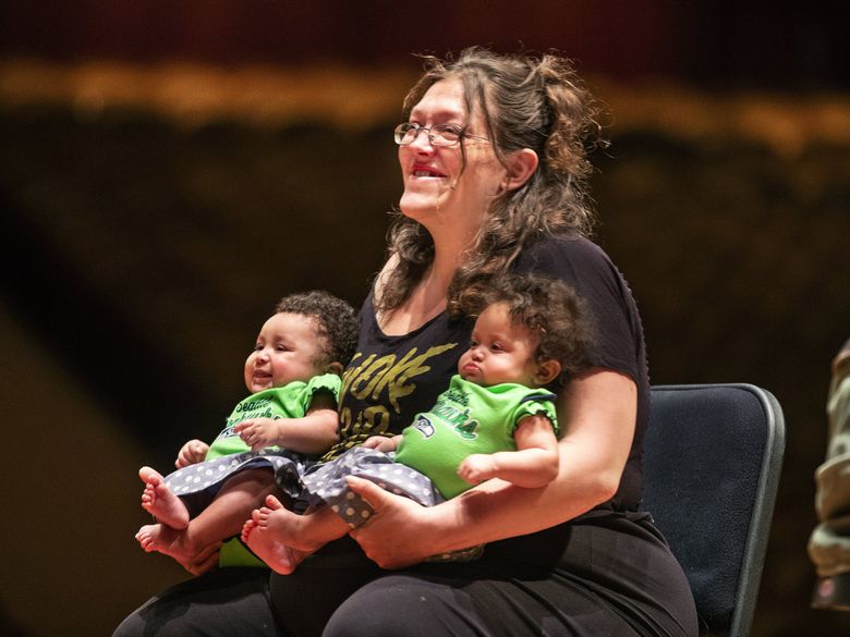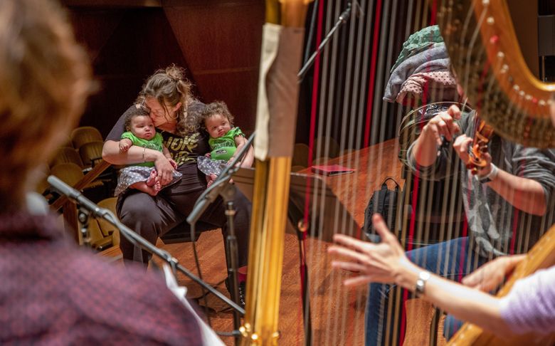 On a recent spring morning, Shawna Percival wheels her double stroller onto the stage of Benaroya Hall, home of the Seattle Symphony. She takes her girls with her everywhere when she’s not at work. Shifting blankets and diaper bags, Percival removes the babies from their stroller, then takes a seat facing three musicians on stage, a baby in each arm.