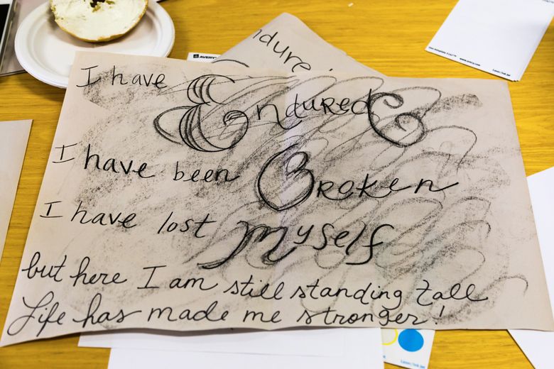 Each organization’s clients responded to a different holiday movement: Washington’s Birthday (Catholic Housing Services at Dorothy Day); Decoration Day (military veterans from Compass Housing Alliance); The Fourth of July (Mary’s Place); and Thanksgiving and Forefathers’ Day (Cascade Women’s Program of Compass Housing Alliance).