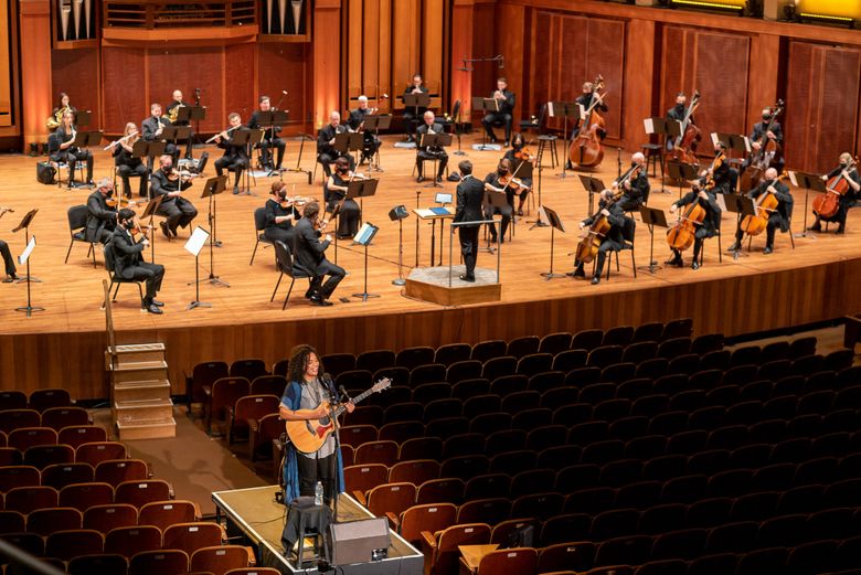 Mongé, a Seattle-based singer-songwriter and guitarist, opened the program by performing four of her songs with Mills and the Symphony, in orchestrations by Andrew Joslyn. She has a warm, distinctive, and rather husky contralto, and her songs are easy on the ear. (One of them, “Crash,” is reminiscent of an old Stephen Stills song, “Love the One You’re With.”)