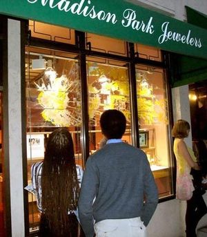 Down the street at Madison Park Jewelers, artist Cristin Ford has installed a crystalline, three-dimensional piece titled “Plasti-