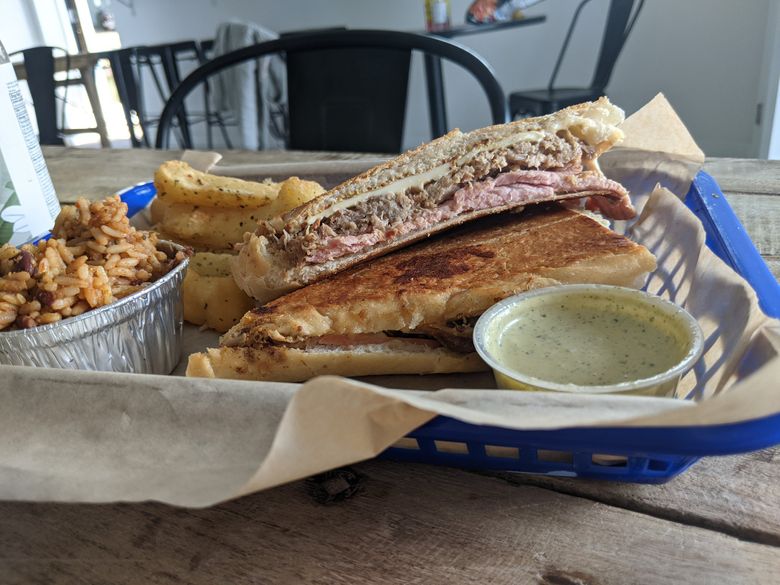 Here, you’ll run right into Cubanos on Wheels cafe (22341 Marine View Drive S., Suite E; 253-326-1244; cubanosonwheelsllc.com), which specializes in “Cuban fusion with a Southern flair.” I ordered a classic Cubano sandwich ($13.99), a side of yucca fries ($6) and a guava pastelito ($4). The sandwich’s crackly pressed exterior gave way to juicy roast pork and sliced ham topped with thin sliced pickles, oozy Swiss American cheese and a tangy mustard. The sandwich is delightfully messy — drips of pork fat are apt to run down your hand while you’re eating. The salty, starchy, pillowy yucca sticks are perfect on their own, but also nice dunked into the creamy garlic sauce that accompanies the sandwich. The cream cheese and guava pastelito was flaky and rich. (I should’ve saved it for the boat ride home.)