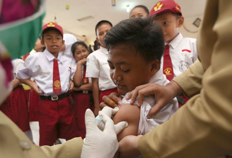 Children in school uniforms and toddlers clinging to their parents received shots at a high school in Indonesia’s capital, Jakarta, on the first day of the campaign Monday.