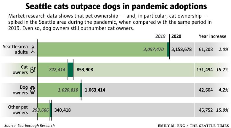 According to data from market-research giant Nielsen, the number of adults in the Seattle metro area who own a cat jumped 18% in the early months of the pandemic, compared with a much more modest 4% for dog owners.