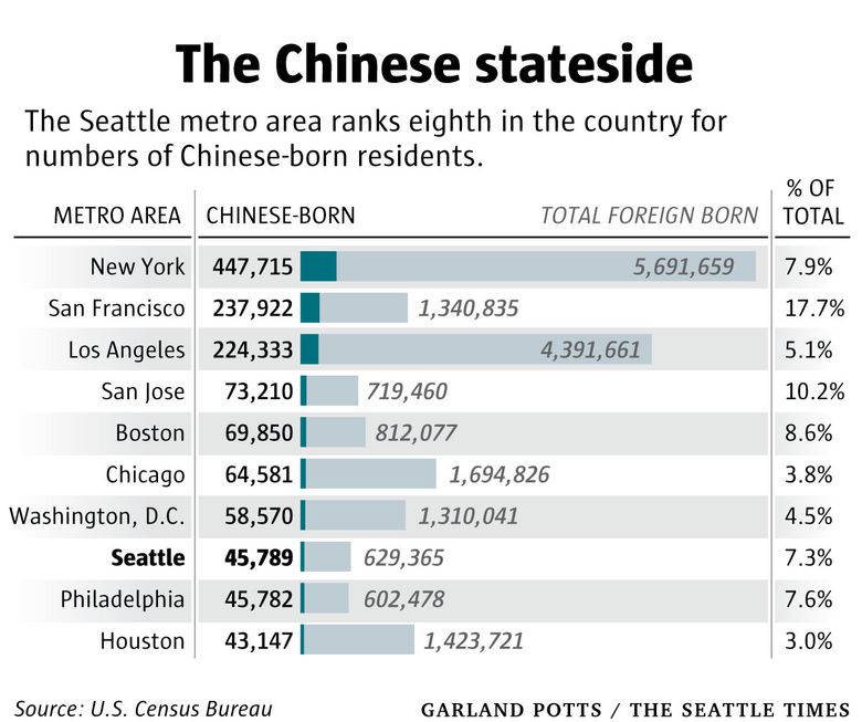 The Seattle-Tacoma area is home to more than 45,000 people who were born in China — among U.S. metros, that ranks as the eighth-largest such population. The city of Seattle is home to about 12,000 of them.