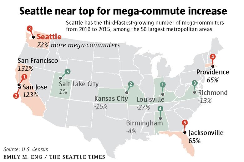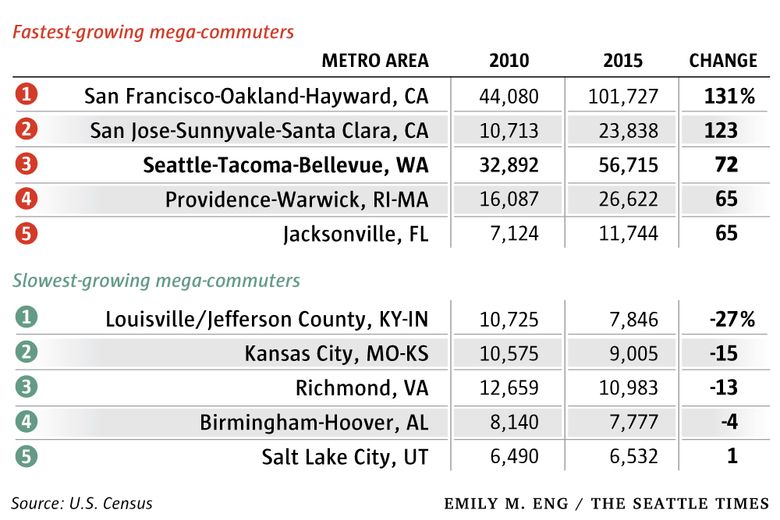 In 2015, about 57,000 people in the Seattle area endured commutes of at least 90 minutes from home to work, a jump of nearly 24,000 since 2010. That equals a 72 percent increase in just five years, ranking Seattle third among the 50 largest U.S. metros for the rate of growth for mega-commuters.