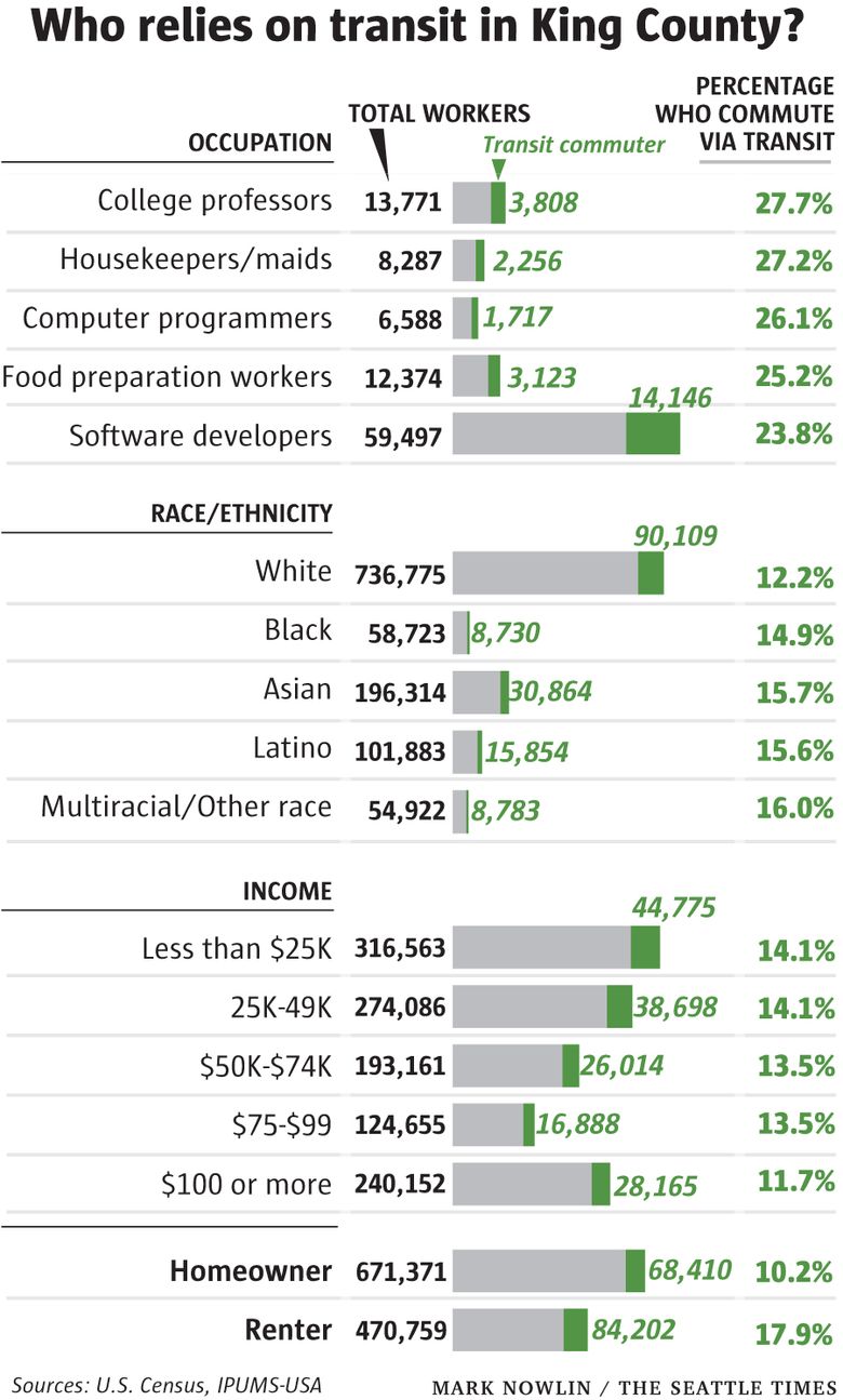 College professors rank No. 1, with about 28 percent taking some form of transit to get to work — that’s more than twice the King County average of 13 percent. Housekeepers are just a fraction behind, with computer programmers in third place. Rounding out the top 5 are food-preparation workers and software developers, in that order.