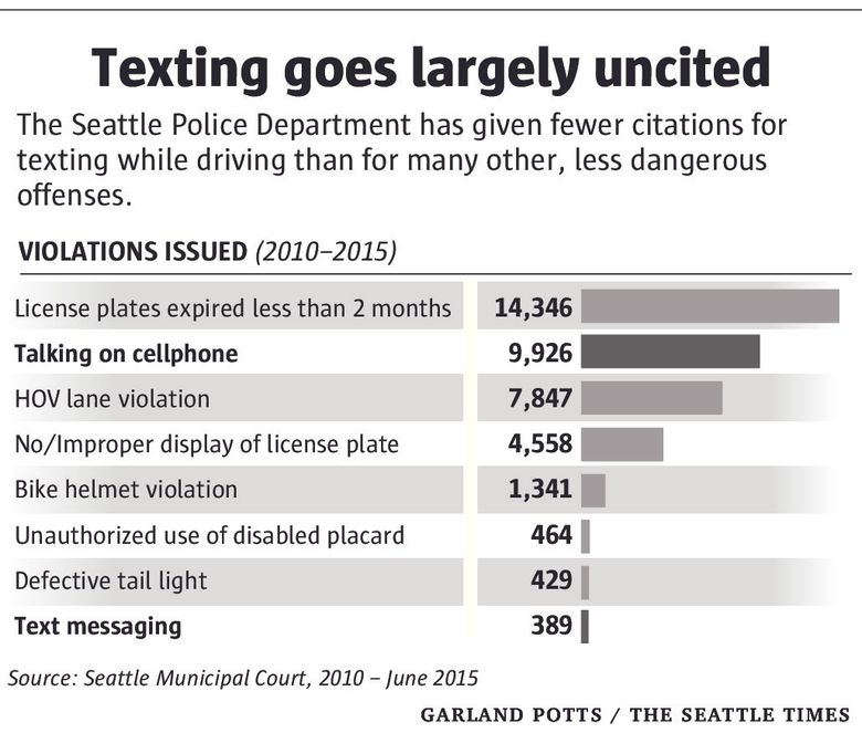 In an average week, fewer than two drivers in Seattle get cited for the offense. Analysis of Seattle Municipal Court records shows that in 2014, Seattle police issued a total of just 101 tickets for texting while driving.