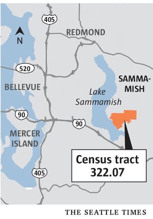 The winning tract is in Sammamish — in an area that stretches inland from southeast Lake Sammamish — and home to about 3,200 people. According to 2014 income estimates from Nielsen, this tract has a median household income of $124,600. In other words, half the households here earn more, and half earn less.