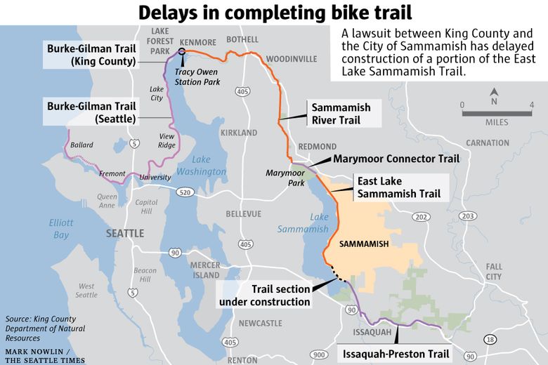 Completion of the East Lake Sammamish Trail has been delayed by a legal dispute between King County, which owns the former railroad corridor, and the city of Sammamish, which says it should be able to regulate its streets where they cross the trail.