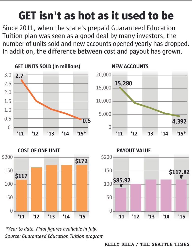 To be sure, 2011 was one of GET’s hottest years ever — a time when tuition was rising by 16 to 20 percent annually. Parents flocked to the program, snapping up more than 2.5 million units at $117 apiece that year, banking on the idea that tuition would soon zoom above $11,700 a year. (One hundred GET units pay for one year’s tuition and fees at the state’s most-expensive university, and can also be used for some other college expenses.)