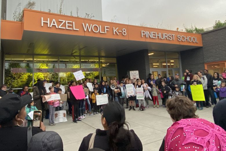 A crowd of students and parents protested outside Hazel Wolf K-8 in Seattle’s Northgate area Friday morning, calling for more action in response to racial bullying there.