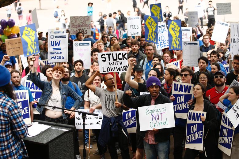 Graduate students on all three campuses – Seattle, Bothell and Tacoma – say their wages aren’t keeping up with the rising cost of living in the region. Their contract expired April 30, and on May 15 they held a one-day strike, which led to the cancellation of some classes.
