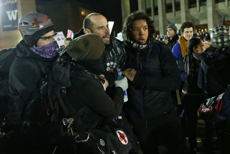 People began lining up for the speech late in the afternoon. The crowd began clashing about two hours later, when a group of people dressed in black showed up and forced its way to the front of the line. One man waved a black-and-red anti-fascist flag, and another shouted to the people in line: “Go back to Bellevue, rich kids!”