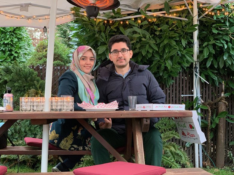 Married couple Mohammad Taha Bahadori and Sama Ghoba were outright celebrating the inauguration, sharing a pizza in the afternoon at a cafe picnic table. The two had been separated for more than three years by the travel ban. Bahadori, who works for Amazon, lived in Seattle while Ghoba lived in Iran, one of the countries named in the ban.