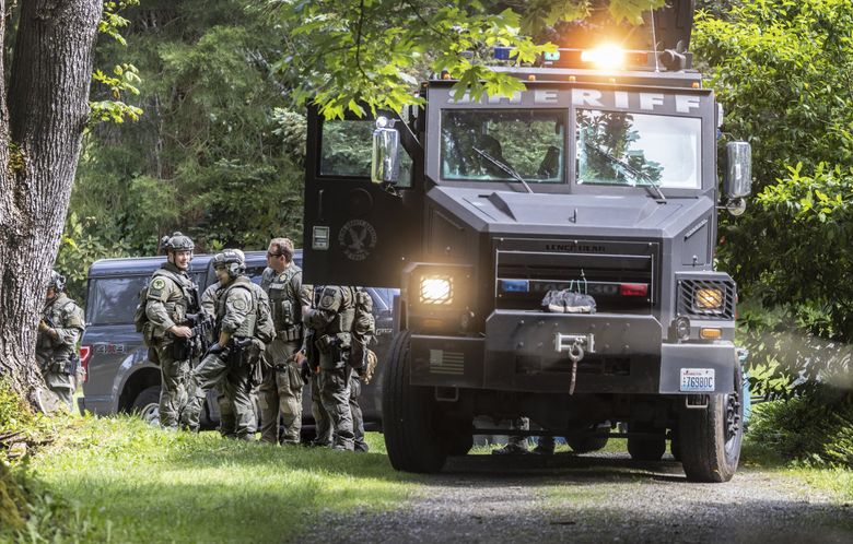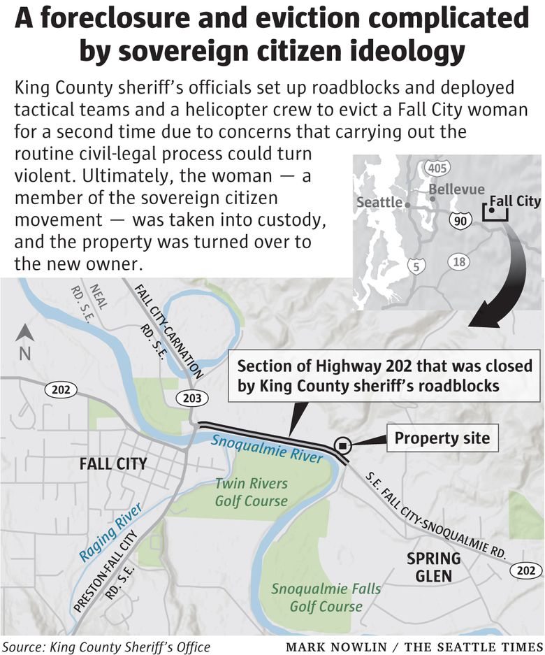 Sheriff’s officials learned of her involvement in the sovereign citizen movement and found an untraceable ghost gun the first time around. So they weren’t taking any chances when they returned to remove her from the white, wood-sided house on Southeast Fall City-Snoqualmie Road.