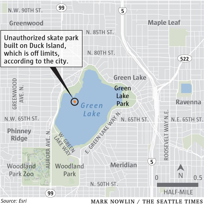 Seattle Parks warns people to not even “set foot on” Green Lake’s Duck Island, considered by the city a wildlife habitat, where skateboarders have built a concrete skate bowl.