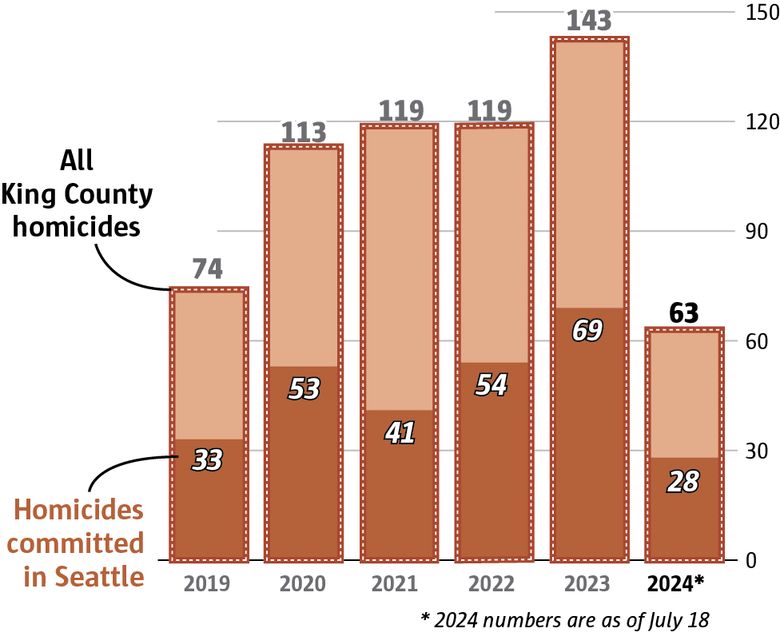 In Seattle, police went 48 days without responding to a homicide in the spring — besting their 35-day streak in winter 2023, The Times’ data shows. There have been 28 homicides committed in the city so far this year, not counting the March fatal shootings of two 16-year-old boys on Interstate 5 in the University District that are being investigated by the Washington State Patrol. The Seattle victims include four juveniles and seven young adults, ages 20 to 25.