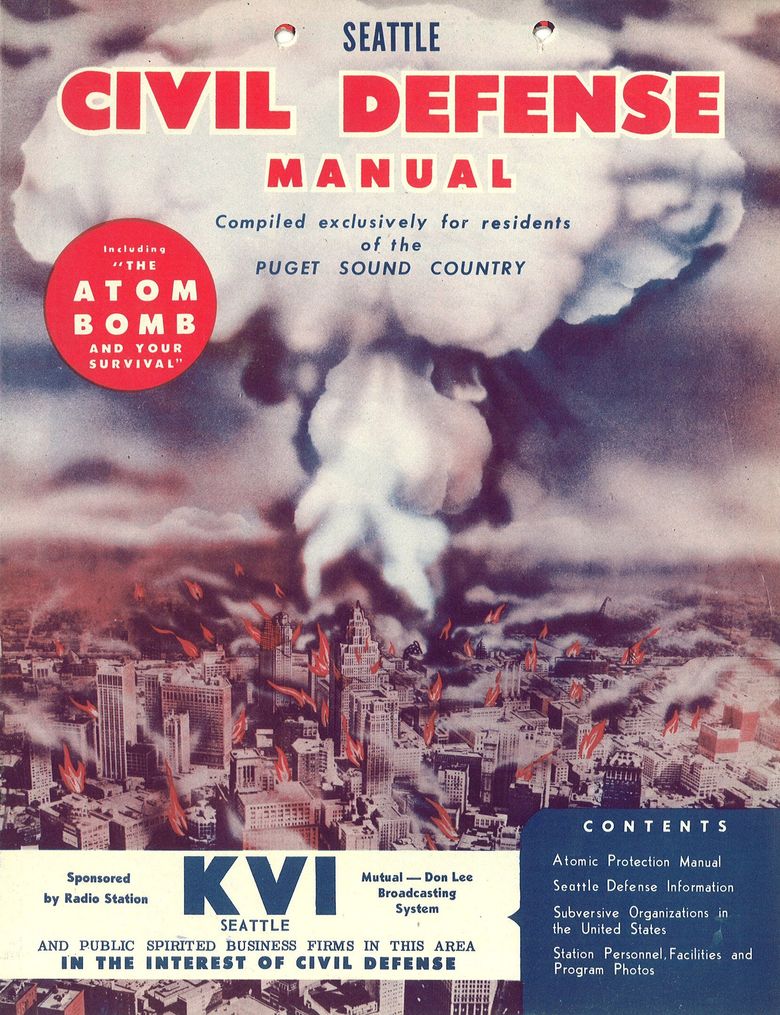 Back during the Cold War years, a 1951 civil-defense manual sponsored by KVI Radio, then a market leader, showed a mushroom cloud detonating over downtown Seattle, red flames erupting into the sky.
