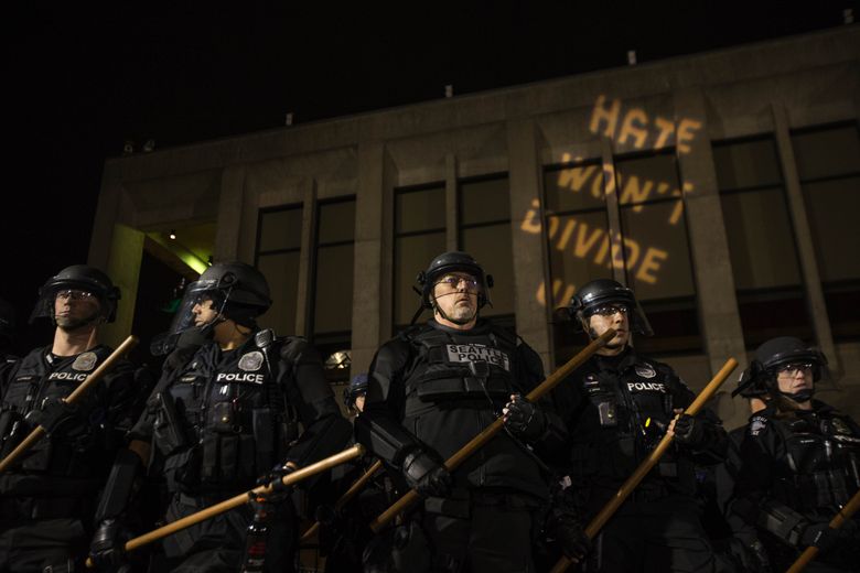 Meanwhile, protesters outside Kane Hall hurled bricks and other items at police officers, according to the Seattle Police Department. They also threw fireworks and paint.