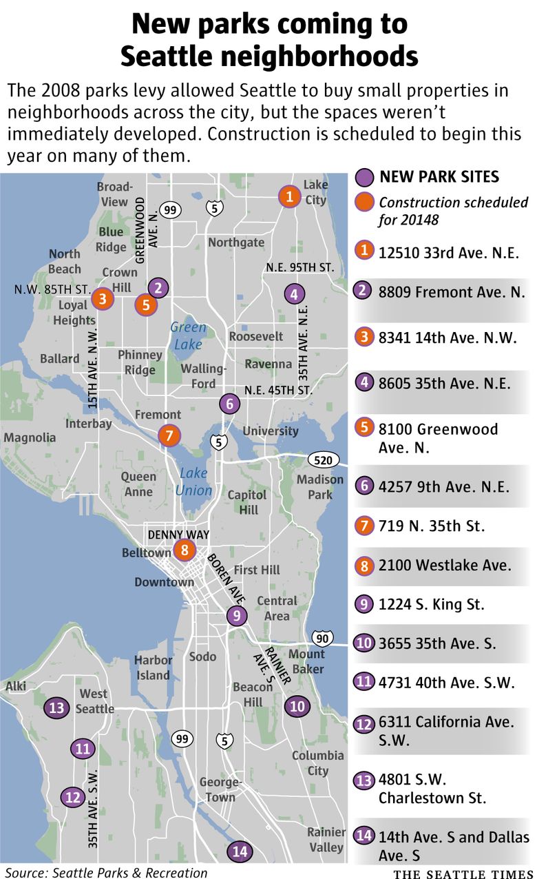 Construction is now scheduled to begin this year at five of the 14 new parks — in Denny Triangle, Lake City, Fremont, Greenwood and Crown Hill — and for several others in 2019, according to Parks and Recreation.