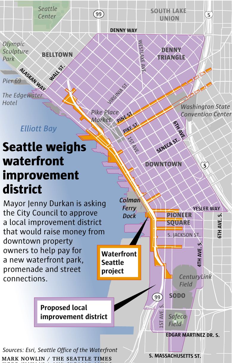 The tax would be levied against property owners within a district stretching from T-Mobile Park to Denny Way and from Elliott Bay to Interstate 5.
