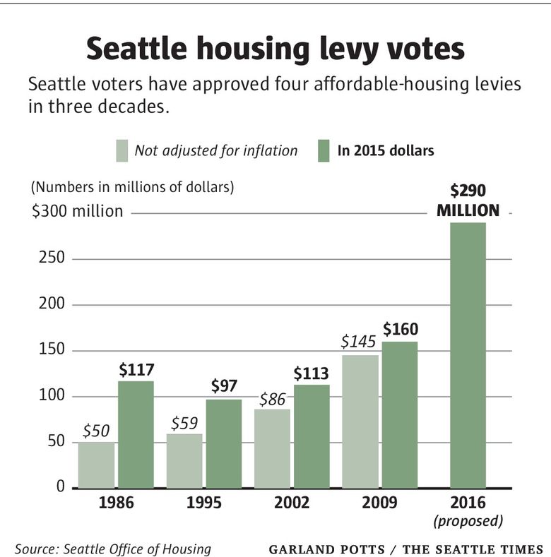 Seattle voters have approved four affordable-housing levies: $50 million in 1986, $59 million in 1995, $86 million in 2002 and $145 million in 2009.