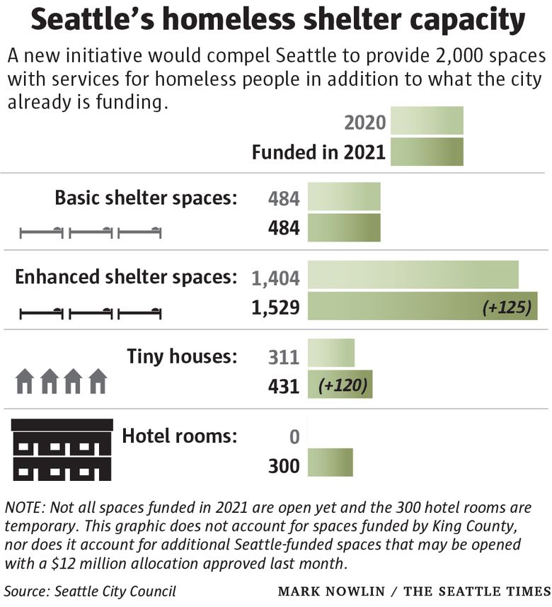Nearly 3,800 people were unsheltered in Seattle last January, according to an annual estimate. The city budgeted for more than 2,700 shelter spaces, tiny houses and hotel rooms this year, according to the council; a $12 million boost last month could add many more.