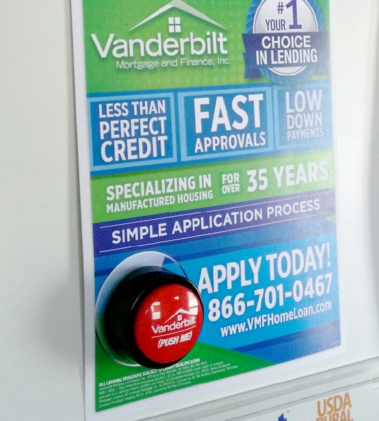 The lender board also has a single large red button labeled, “PUSH ME.” By law, Clayton sales agents aren’t allowed to pitch for Vanderbilt. But if they or a customer presses the red button, a digital recording does it for them: