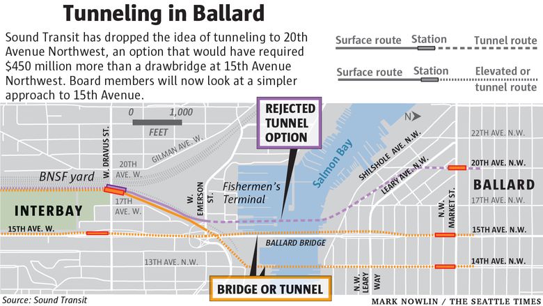 The central Ballard route called for a tunnel under Fishermen’s Terminal to 20th Avenue Northwest near Market Street, costing $450 million more than a basic, 70-foot high drawbridge at 15th. A tunnel at 15th might be $100 million less than digging to 20th.