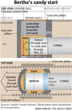 When 2016 begins, the machine is scheduled to push through the concrete north wall of the vault, then spend four weeks moving through a mix of clay and sandy soil for another 450 feet. If all goes well, it would stop in late January for a few weeks’ inspection before diving under the Alaskan Way Viaduct, which is predicted for March. The viaduct will be closed for about two weeks as a precaution, in case Bertha causes excessive underground vibrations.