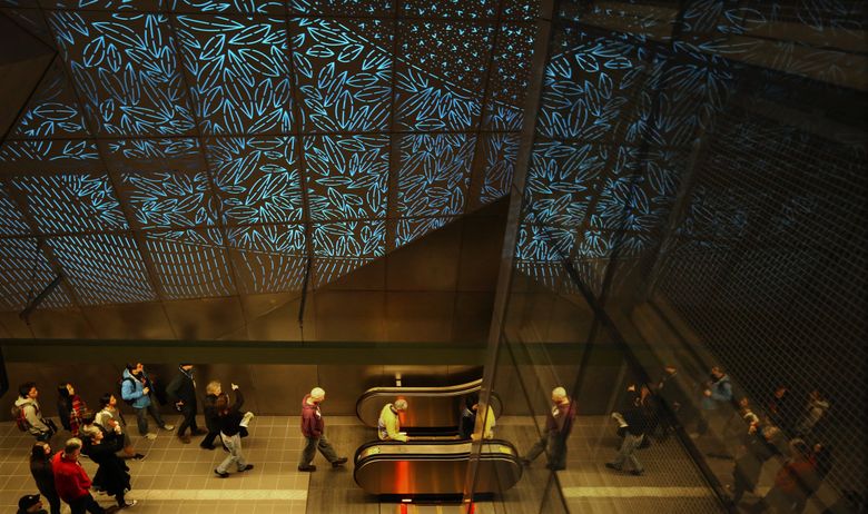 “This is pretty cool,” Fields said, taking his 10-year-old son, Jayden, to check out the art inside the Capitol Hill station, which includes a mobile of pink fighter-plane parts hanging above the train platform. “We hope it makes the traffic better.”