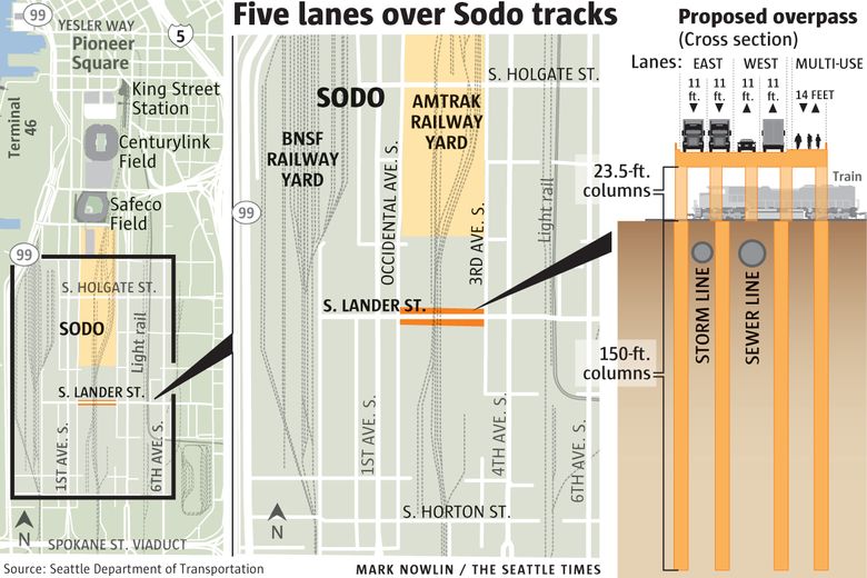 The proposed concrete bridge, going east-west above four pairs of tracks south of the stadiums, has been promoted by Northwest port and trade coalitions since the early 1990s, and has appeared in statewide freight plans since 1998. About 11,000 vehicles a day cross the tracks at Lander, while 3,200 freight and passenger-rail cars travel the north-south line. The street is closed an average 4 ½ hours a day.