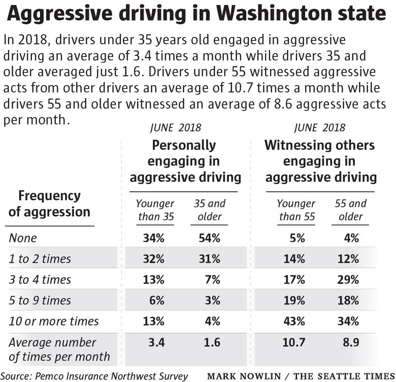 In PEMCO’s poll, drivers in Washington and Oregon admitted to acting aggressively about 2.1 times per month. That’s up from an average of 1.3 risky behaviors per month reported in 2015, the last time the insurance company conducted this survey.