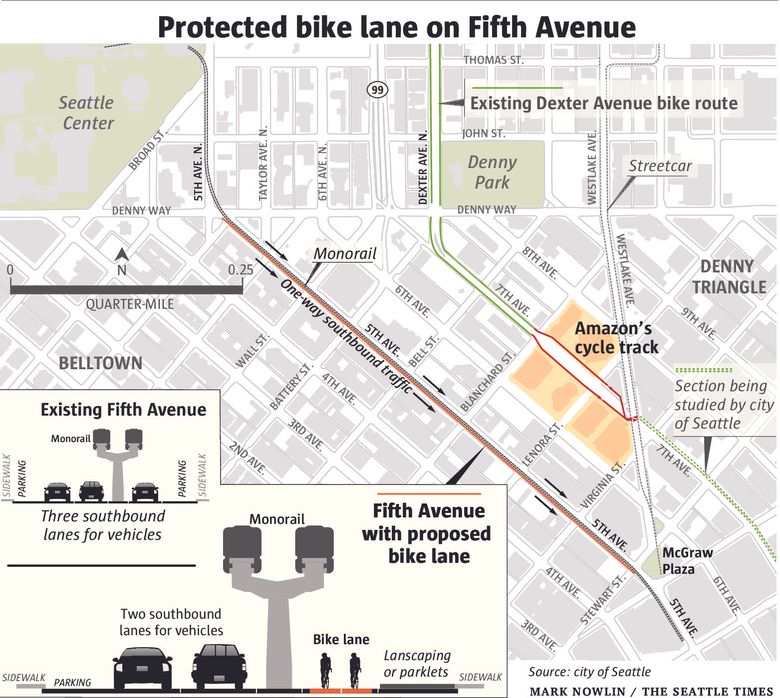 In the shadow of the Seattle Center Monorail, bicyclists might someday get their own protected lane on Fifth Avenue, in a potential city retrofit.