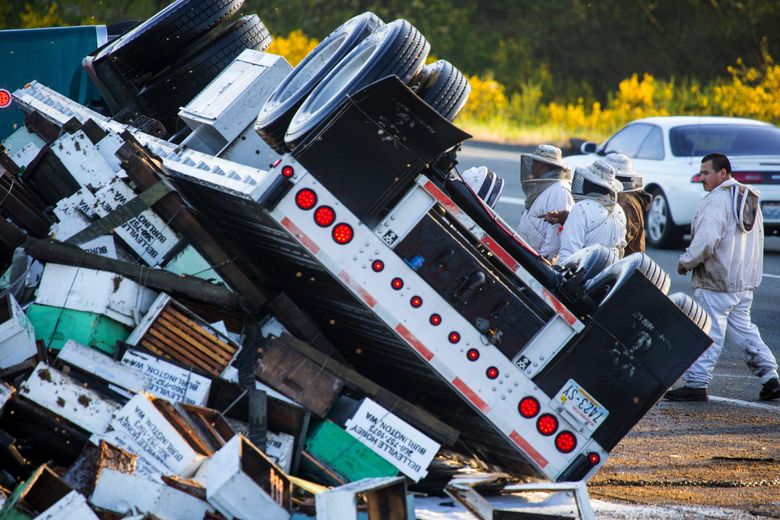 The overturned truck held 448 hives with as many as 14 million bees, Leary said. The honeybees, headed from Sunnyside, Yakima County, for pollination at a blueberry farm in Lynden, Whatcom County, were worth $92,000, he said.