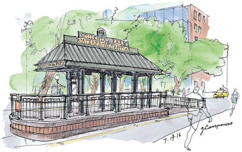 The old waterfront streetcar stop at Occidental Park still serves a purpose: It makes for picturesque sketching and slows down traffic. It’s also a reminder of the failed attempts to incorporate the old line, in service between 1982 and 2005, into the redesign of the Seattle waterfront.