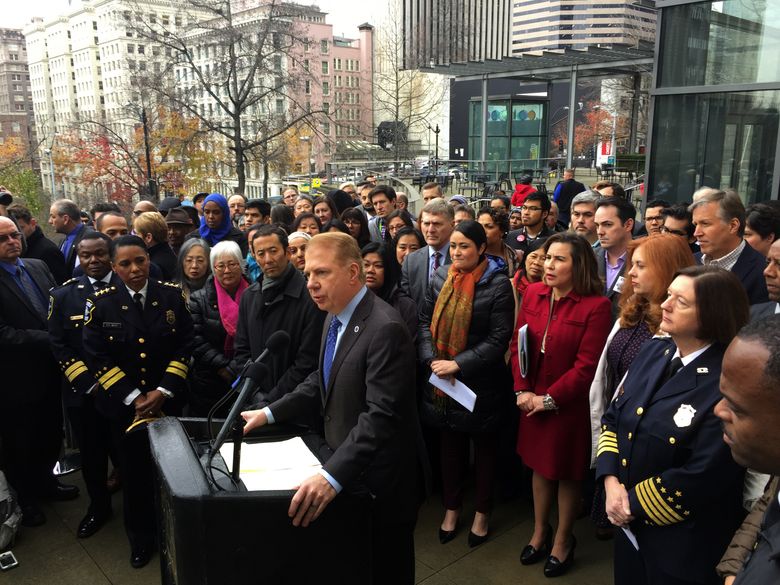 Surrounded by hundreds of supporters on the steps of Seattle City Hall, Mayor Ed Murray called Wednesday “the darkest day in immigration history in America since the internment of the Japanese Americans” and said he’s prepared to lose “every penny” of federal money the city gets.