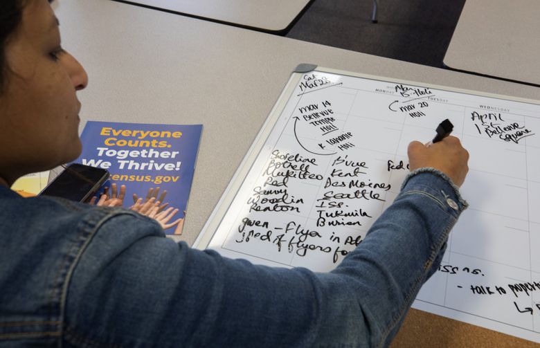 Last month, in the India Association’s Redmond office, executive director Uppala, a former toxicologist, mapped out an exhaustive strategy with about a dozen volunteers. On a white board was a list of volunteers Uppala identified as young mothers, who had agreed to host census parties in their homes. Many of the association’s volunteers, some 55 in all, are spouses of H-1B visa holders without work permits themselves, and they have thrown themselves into the work.